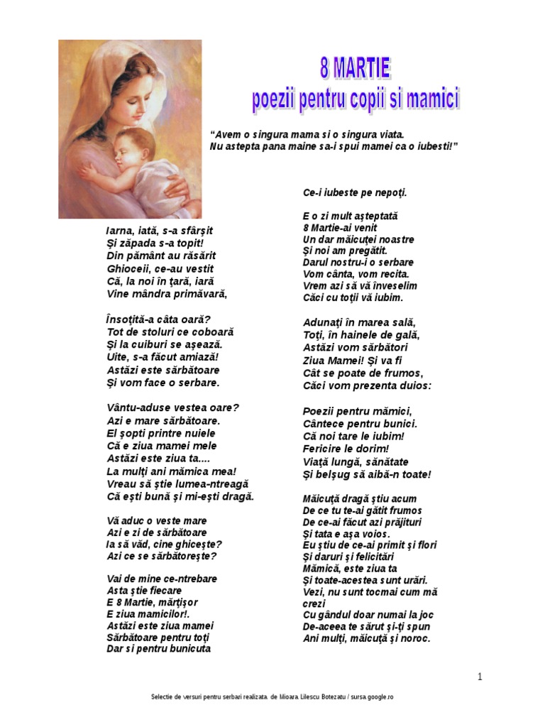 Cantec pentru mama 8 martie ziua mamelor. Suava ca un ghiocel obrajii de lalea parfumul ei de trandafir asa e mama mea. învaţă mă ce i bine fereşte mă de rău căci am venit pe lume. Vezi lista de mai jos.