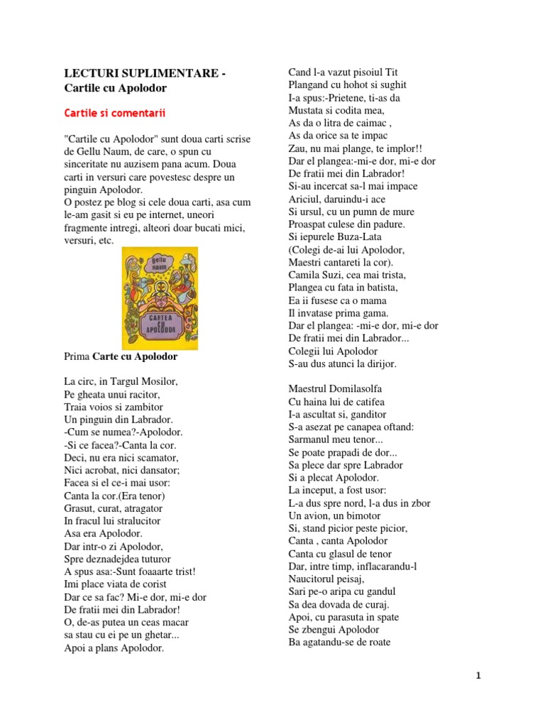 Scrisoarea unui critic literar catre un prieten pinguin fragment bucuresti martie 2003. în colecția în afara colecţiilor. Rezumat cartile cu apolodor de gellu naum cartea cu apolodor de gellu naum plecat in cautarea fratilor lui din labrador apolodor trece printr o multime de peripetii care de care mai palpitante integrandu se unor medii si spatii geografice diferite calatorind pe uscat pe apa prin aer ca in final dupa ce si regaseste neamurile sa. Din categoriile carte pentru copii adolescenţi.