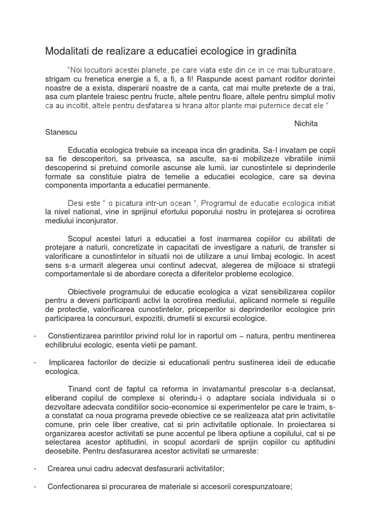 Activitati de educatie ecologica in gradinita. Foloseste te de pamant pietricele frunze nisip si alte elemente care pe langa faptul ca fac parte din natura sunt si o componenta importanta a educatiei senzoriale. Noi toti suntem responsabili in a construi un mediu educational care sa motiveze copilul in procesul de protejare a naturii si este esential ca omul sa fie educat in spiritul respectului fata de mediu. Silvia breben elena gongea elena matei georgeta ruiu cunoasterea mediului inconjurator ghid pentru invatamantul prescolar editura radical 2001. învăţământ gimnazial biologie.