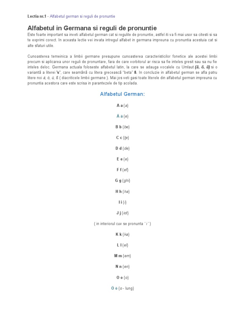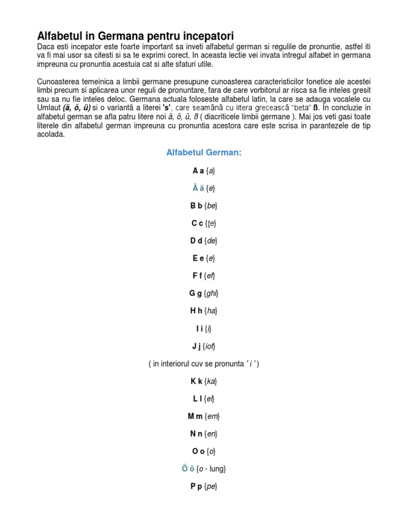 Alfabetul german a a b be c te d de e e f ef g ghe h ha i i j iot k ca l el m em n en o o p pe q cu r er s es ß es tet t te u u v fau w ve x ics y üpsilon z tet in plus mai sunt si vocalele cu um lectii de viata lectii de scoala tutoriale lectia de germana lectia 2 alfabetul german numerele zilele saptamanii pronuntia pagina 0. Trei litere cu umlaut ä ö ü si simbolul ß numit eszett sau scharfes s. Această pagină poate conține caractere unicode modifică date text limba germană în germană deutsche sprache uzual deutsch ˈdɔʏtʃ ajutor info aparține grupului vestic al limbilor germanice. înainte să citiți țin să fac precizarea unde am scris că litera se pronunță într un fel m am referit doar la pronunția ei nu și în cazul pronunției acesteia când stă pe langă alte litere grupuri de litere.