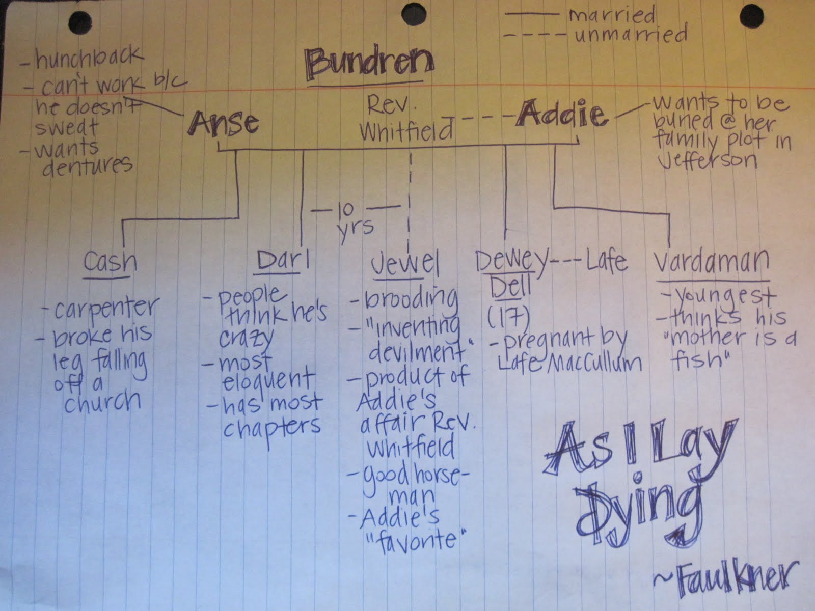 As i lay dying family tree. The title derives from book xi of homer s odyssey william marris s 1925 translation wherein agamemnon tells odysseus. Faulkner contrasted the snopes family recurring characters in the yoknapatawpha novels and stories of william faulkner notably the hamlet 1940 the town 1957 and the mansion 1959. Did not have a very happy life never a happily ever after with anse. Tips and tricks for teachers.