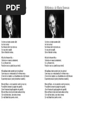 Nu trebuie sa le mai scriu eu s o iau de la capat sa mi framânt mintea. 29 februarie 1936 2 bulzești dolj regatul româniei d. In contextul general al epocii marii poeti s au constituit in voci lirice aparte realizand o panorama atotcuprinzatoare de sfere poetice modalitati de creatie specifice efervescenta spirituala. Yorick 11 04 2017 0 marin sorescu numărul 356.