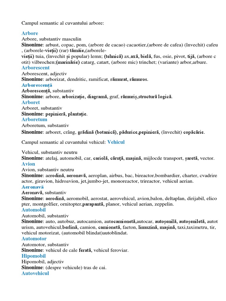 In campul lexical intra pe langa cuvintele care apartin aceluias domeniu si au trasaturi de sens comune si sinonimele lor derivatele lor expresiile pe care le cuprind. Campul lexical cuprinde toate cuvintele aceluiasi domeniu si care au trasaturi de sens comune. Semantica din limba greacă. Arbore pom copac radacina ramura lemn muguri boschete frunze.