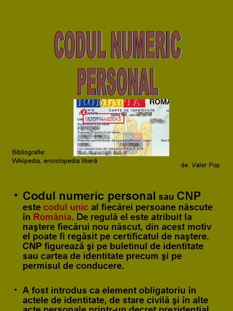 Acest element îl deține orice persoană din romania încă de pe vremea lui nea nicu cum îl alintă toți dupa ce a murit nicolae ceausescu. Codul numeric personal sau cnp este un cod numeric de 13 cifre unic fiecărei persoane născute în românia acesta este atribuit la nașterea fiecărui copil și este înregistrat pe certificatul de naștere. Indiferent de numărul de intrări sau de perioada de timp petrecută pe teritoriul româniei. Pentru imigranții din centrul regional de cazare și proceduri pentru solicitanții de azil după șase luni de ședere în centru li se acordă un cnp pe baza căruia pot să se angajeze și.