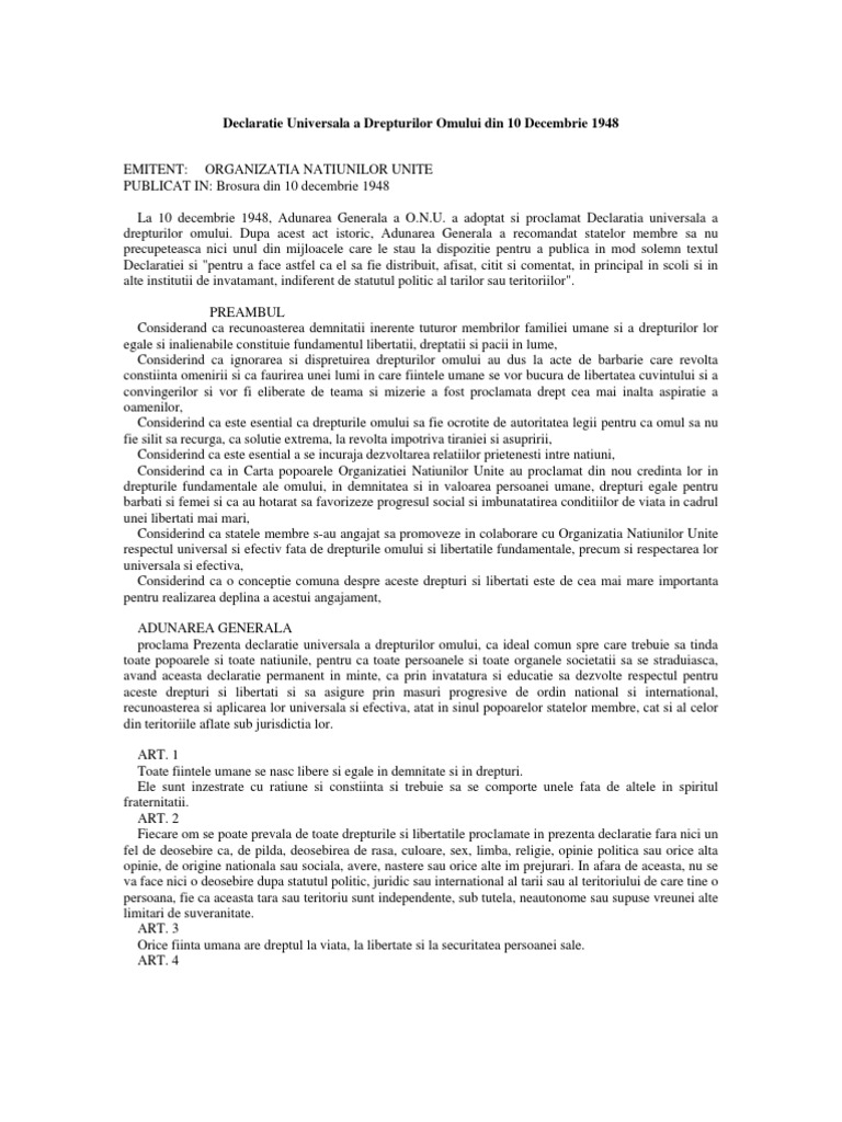 Declaratia universala a drepturilor omului adoptata de adunarea generala a organizatiei natiunilor unite la 10 de septembrie 1948 preambul considerind ca recunoasterea demnitatii inerente tuturor membrilor familiei umane si a drepturilor lor egale si inalienabile constituie fundamentul libertatii dreptatii si pacii in lume.