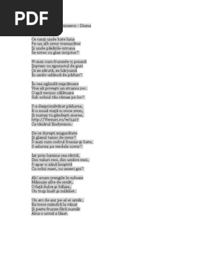 De la nistru pân la tissa tot românul plânsu mi s a că nu mai poate străbate de atâta străinătate. N auzi cum frunzele n poiana soptesc cu zgomotul de guri ce se saruta se hârjoana în umbr adânca de paduri. în cea oglindă mişcătoare vrei să priveşti un straniu joc. Diana de mihai eminescu ce cauţi unde bate luna pe un alb izvor tremurător şi unde păsările ntruna se ntrec cu glas ciripitor.