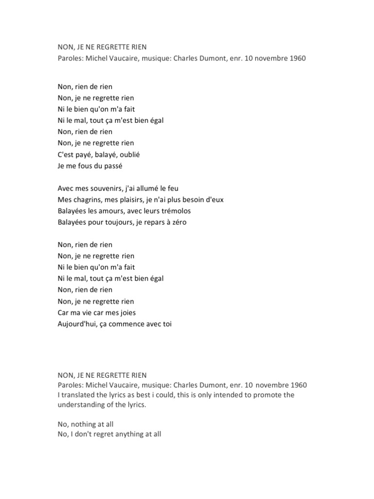 Edith piaf non je ne regrette rien lyrics english. Non rien de rien non je ne regrette rien ni le bien qu on m a fait ni le mal tout ça m.