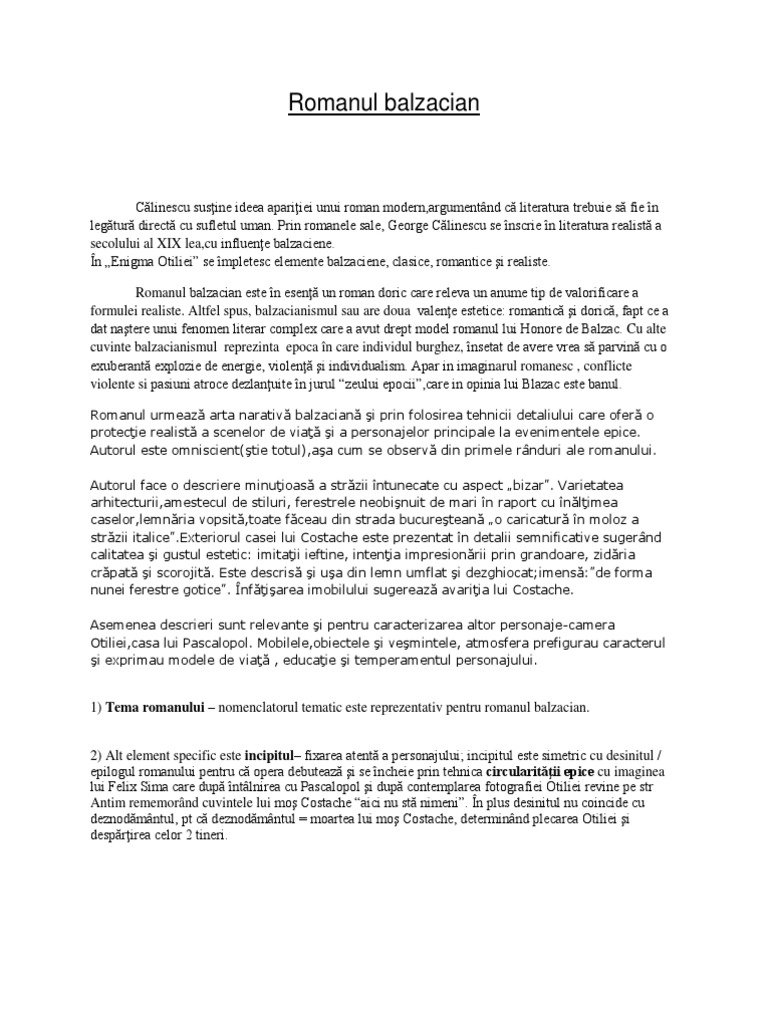 Enigma otiliei roman balzacian. Comentarii romanul realist balzacian interbelic trasaturi ale romanului obiectiv enigma otiliei g. Enigma oriliei este un roman balzacian deoarece cuprinde anumite trasatori folosite de balzac tema operei o constituie incercarea familiei tulea de a mosteni averea lui costache giurgiuveanu fresca bucurestiului de la inceputul secolului al xx si procesul de maturizare a tanarului student la medicina felix sima opera capatand o tenta de bildungsroman. Interioare si exterioare romanul dand astfel o imagine cuprinzatoare asupra vietii reinviind o intreaga lume fresca a acelui timp. De obicei este structurat pe mai multe planuri remarcandu se mobilitatea in timp si spatiu mai multe conflicte.