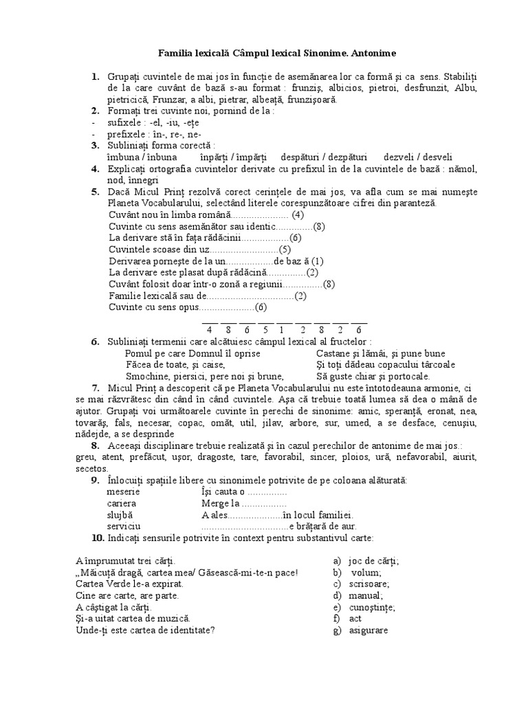 Familia lexicala si campul lexical. Examenultau ro îţi pune la dispoziţie toată materia disciplinelor română şi matematică din care se va susţine examenul de evaluare naţională clasa a viii a. Fisa elevului clase lexicale camp lexical familie lexicala 1. Familia lexicala a unui cuvant sunt cuvintele cu acelasi radical al cuvantului plus sufixe sau prefixe cuvant compus sau format prin conversiune iar campul lexical sunt cuvinte din acelasi domeniu cu cuvantul dat. Familia lexicala campul lexical ai nevoie de ajutor la română.