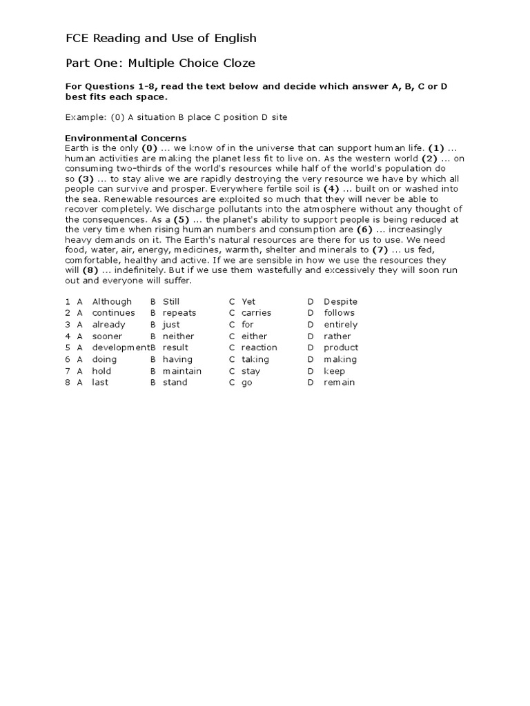 Fce Reading And Use Of English Part 1 Multiple Choice Cloze