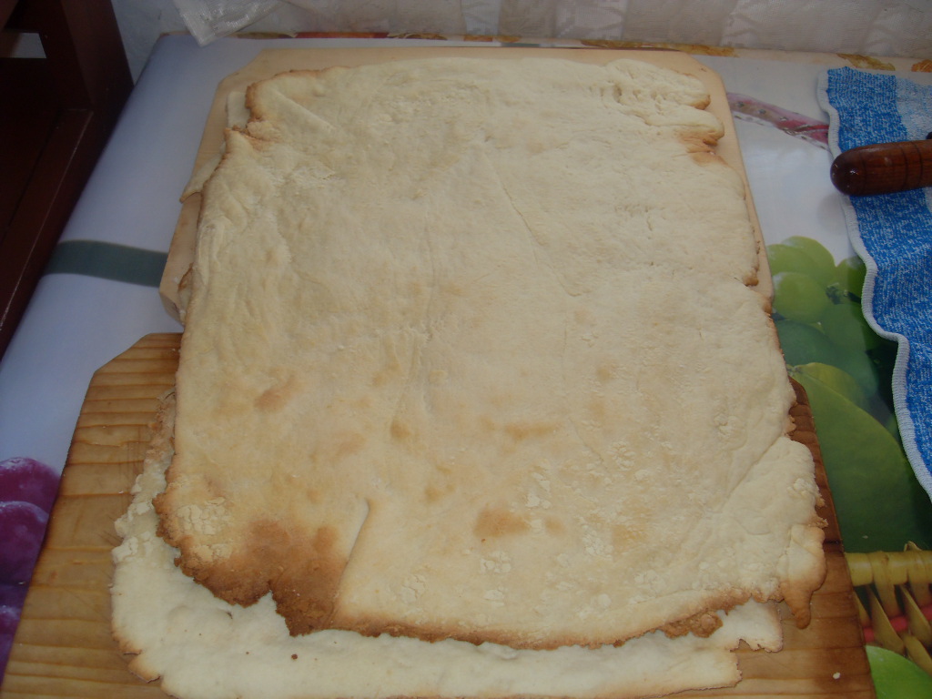 Foaie subtire de dimensiunile tavii. Am luat o bucatica de aluat am asezat o pe hartie de copt si cu ajutorul unui sucitor am intins o foaie foarte subtire pe dimensiunea tavii 27 35cm. Apoi adaugam pe rand celelalte ingrediente si obtinem o coca moale pe care o impartim in 4 parti. Foile se intind usor si se coc foarte repede pana prind putina culoare pe margini.
