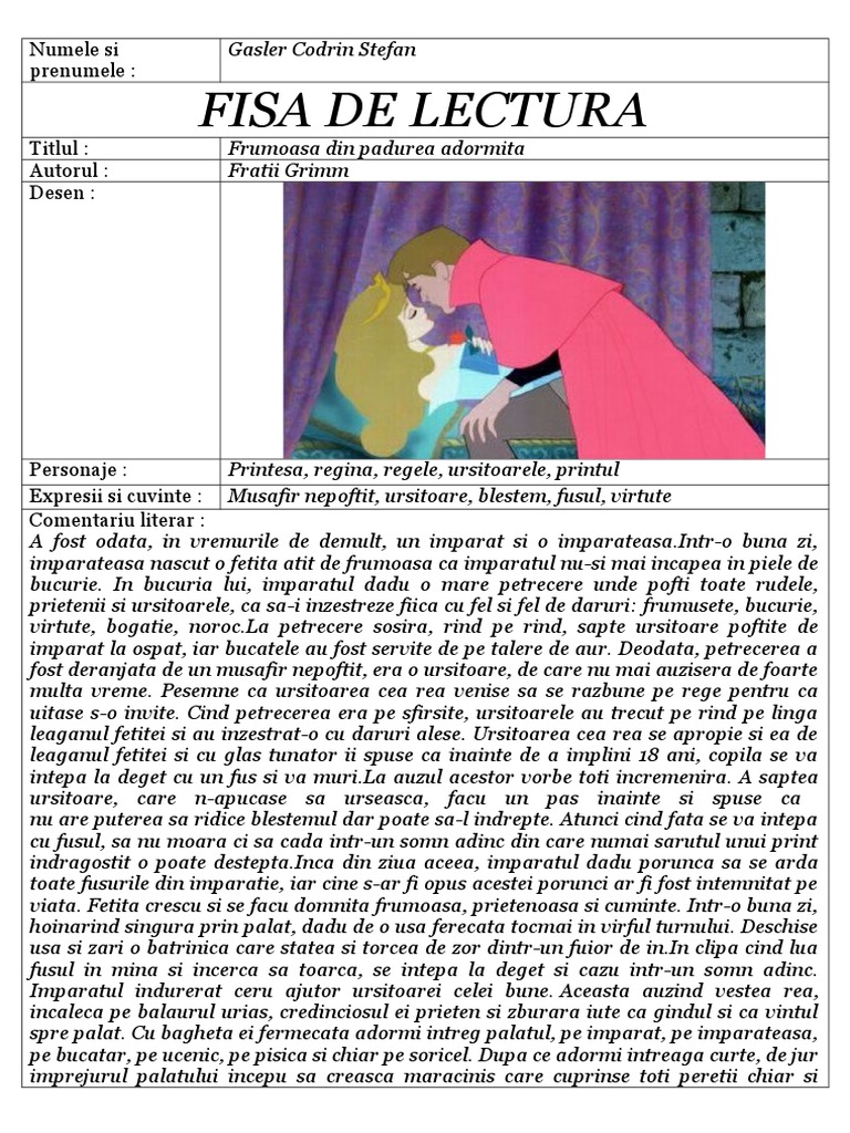 Frumoasa din padurea adormita pdf. Printesa aurora este vrajita de ursitoarea cea rea maleficent ca la cea de a 16 a aniversare sa se intepe intr un fus otravit. V am lasat deschisa sectiunea comentarii in acest sens. După ce ceremonia botezului s a terminat tot alaiul s a întors în palatul regelui unde a fost pregătit ă o mare sărbătoare pentru zâne. Regele care se inapoiase auzi zarva si isi aminti povestea ursitoarei.