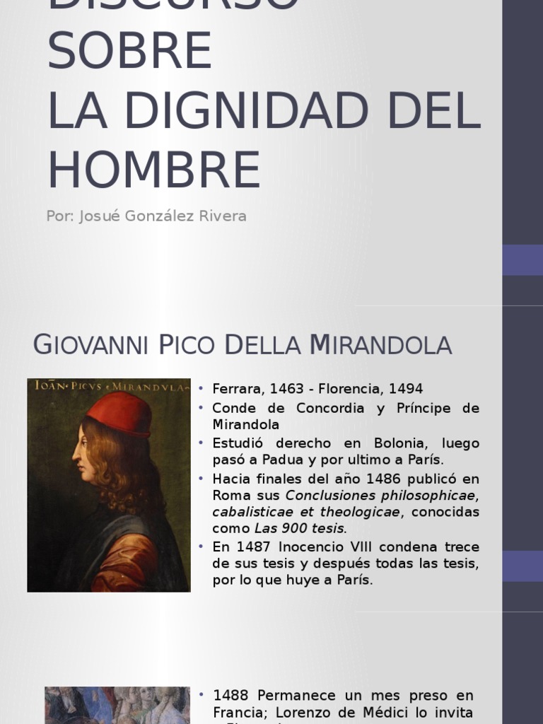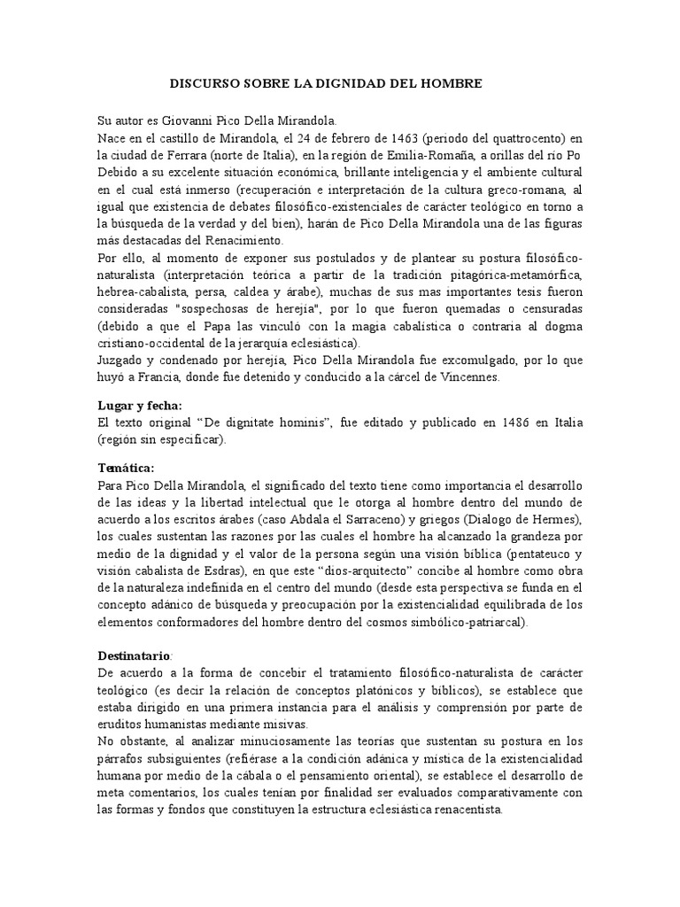 Comentario del discurso sobre la dignidad del hombre fragmento de la primera parte giovanni pico della mirandola 1463 1494 nació en italia a inicios de la edad moderna en un período comúnmente llamado renacimiento. Giovanni pico della mirandola1 relato del génesis discurso sobre la dignidad del hombre2 4 ya el sumo padre dios arquitecto había construido con leyes de arcana sabiduría esta mansión mundana que vemos augustísimo templo de la divinidad.