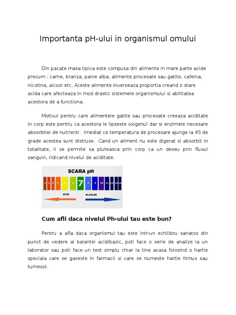Cunoaşterea ph ului este o problemă importantă în practica analizelor de laborator în controlul calităţii produselor în analiza probelor biologice etc. Ph ul corpului uman este o valoare ce face parte din homeostazia necesara functionarii optimale a fiecarei celule in parte. Valoarea ph ului este cuprinsa intre 0 si 14 indicele de 7 0 fiind considerat neutru. în natură valoarea ph ului variază între 0 acid și 14 bazic.