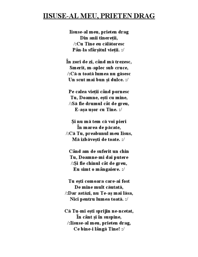 Isuse al meu prieten drag isuse al meu prieten drag din zorii tinereții cu tine eu călătoresc pân la sfârșitul vieții. Si nu ma tem ca voi pieri. Iisuse al meu prieten scump din zorii tineretii cu tine eu calatoresc pan la sfarsitul vietii. Cand am de.