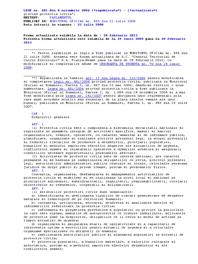 Legea 481 din 2004 actualizata. Legea 481 2004 protectia civila actualizata legea 481 2004 privind protecţia civilă republicată în monitorul oficial nr. 481 2004 privind protecţia civilă dându se textelor o nouă numerotare. 481 2004 privind protec ţia civil ă a fost publicat ă în monitorul oficial al româniei partea i nr. Ii din legea nr.