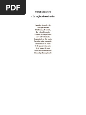 Mihai eminescu la mijloc de codru rezumat. Izvorul traieste nostalgia oglindirii chipului ei in apa sa curgatoare creatoare. La mijloc de codru mihai eminescu demonstratia genului liric la mijloc de codru comentariu la mijloc de codru rezumat lacul de mihai eminescu mihai eminescu 15 ianuarie 1850 15 iunie 1889 s a înscris în romantismul european prin tema iubirii şi a naturii care este predominantă în lirica sa. Opera este o elegie filosofică o confesiune lirică dar poate fi înțeleasă și sub forma unui poem de dragoste. La mijloc de codru des toate păsările ies din huceag de aluniş la voiosul luminiş luminiş de lângă baltă care n trestia înaltă legănându se din unde în adâncu i se pătrunde şi de lună şi de soare şi de păsări călătoare şi de lună şi de stele şi de zbor de rândurele şi de chipul dragei mele.