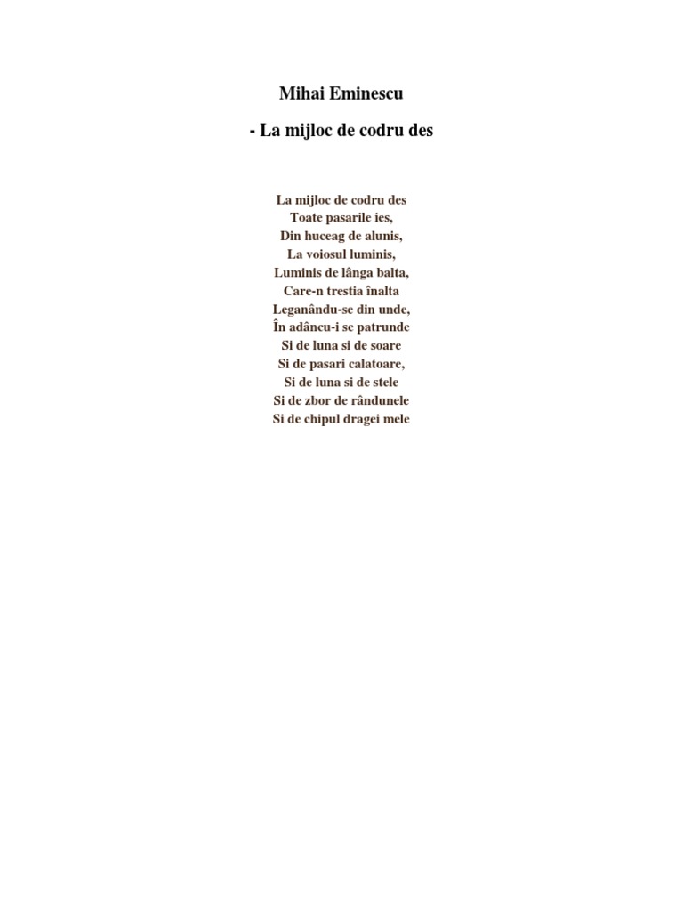 La mijloc de codru des toate pasarile ies din huceag de alunis la voiosul luminis luminis de lânga balta care n trestia înalta leganându se din unde în adâncu i se patrunde si de luna si. La mijloc de codru des toate păsările ies din huceag de aluniș la voiosul luminiș luminiș de lângă baltă care n trestia înaltă legănându se din unde în adâncu i se pătrunde și de lună și de soare. De mihai eminescu este alcatuita din treisprezece versuri nestructurate in strofe inceputul poeziei reia titlul la care poetul adauga un epitet pentru a ilustra bogatia si profunzimile naturii la mijloc de codru des padurea este animata de pasarelele care zboara prin crangul huceagul de alunis miscare exprimata printr o imagine motorie. La mijloc de codru des toate păsările ies din huceag de aluniş la voiosul luminiş.