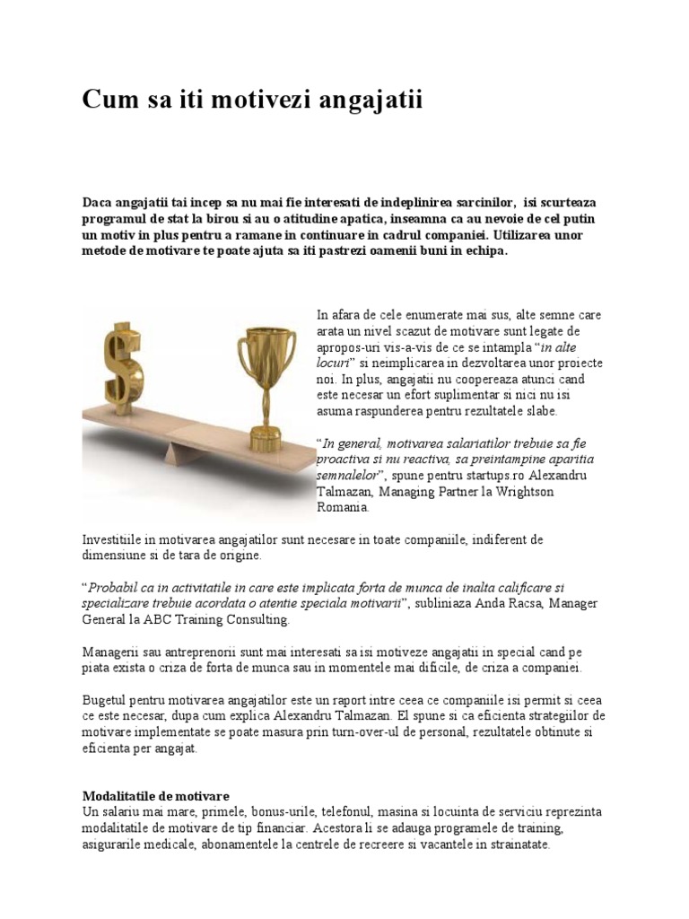Motivarea angajatilor metode sigure de stimulare si beneficii aduse. Academia edu is a platform for academics to share research papers. Motivarea personalului in companiile romanesti trebuie sa se afle pe primul loc in strategia business ului an de an. într o companie motivarea angajaților se poate face strategic printr un program de employee wellness care poate fi implementat sub diverse forme în cadrul unei companii de către angajator sau de către specialiștii hr.
