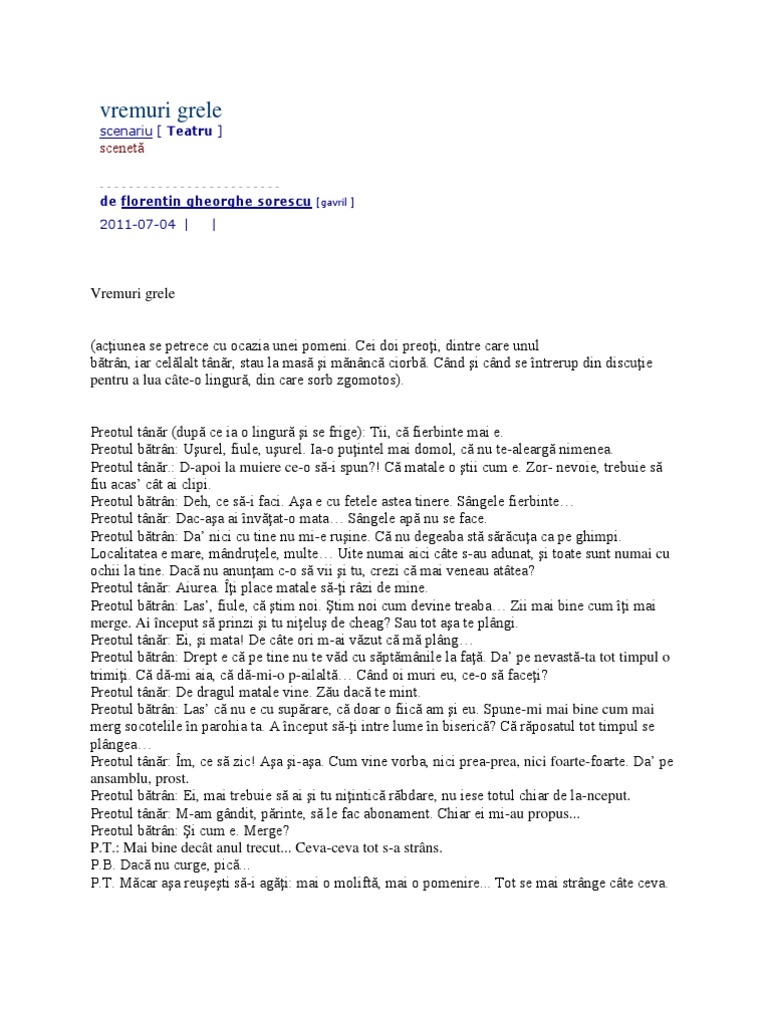 Un mod educativ și relaxant de a petrece timpul li. Exista piese de teatru cu o incarcatura emotionala puternica insa si scrieri mai usoare si hazli pentru clasele mai mici sau chiar de gradinita. Fragmentarea limbajului este susținută de cea a muzicii există o geometrie a mișcărilor siluetele alb negre se desenează pe fundaluri alb negre un pantof roșu țipă în desen o haină verde violentează ochii totul cu eleganța detașată a unei picturi de magritte. Rezultate 1 20 pentru piese de teatru si scenete scurte si amuzante.