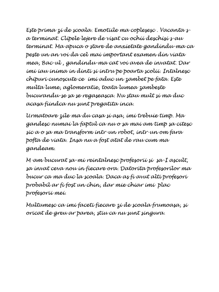 Prima zi de liceu compunere. Cand ne a strigat pe noi cei din clasa a 9 a directorul la carou cei mari radeau de noi eu una ma simteam ca o gaina dusa la taiere. Am fost impartiti in patru clase diferite unii copii au inceput sa planga cand parintilor nu li s a permis in salile de clasa. 24 compunere rămas bun doamna învățătoare. In curtea scolii toti tinerii imi pareau ciudati.