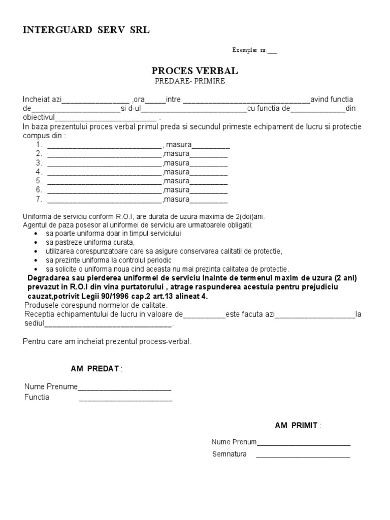 Proces verbal de predare primire. Va rugam sa ne ajutati cu un model de proces verbal de predare primire echipament de lucru materiale de lucru. 3 14 2013 11 02 00 am other titles. Obiectul procesului verbal il reprezinta re innoire echipamente de protectia muncii.