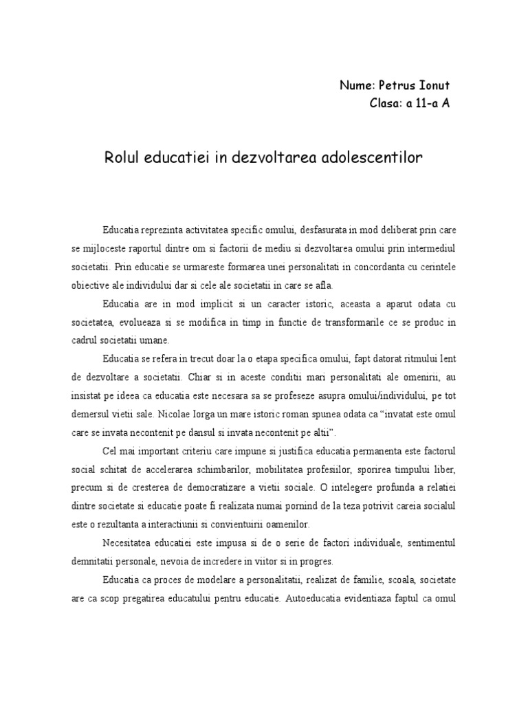 Rolul educatiei in dezvoltarea personalitatii umane educatia in viata unui om are un rol foarte important educatia dezvolta nenumarate laturi senzitive emotionale cat si laturi pragmatice de viata educatia ca definitie este un fenomen social care reprezinta transmiterea de date si trairi existentiale a generalitatilor despre cultura si societate. In opinia mea familia are un rol extrem de important in viata unui adolescent in primul rand familia reprezinta primul cadru de dezvoltare al copiilor. Rolul in formarea individului ca om posibilitatile si limitele educatiei sunt o problema despre care s a discutat si se discuta intens. Analizând dezvoltarea copilului observăm că procesul de maturizare se manifestă pe patru mari direcţii.
