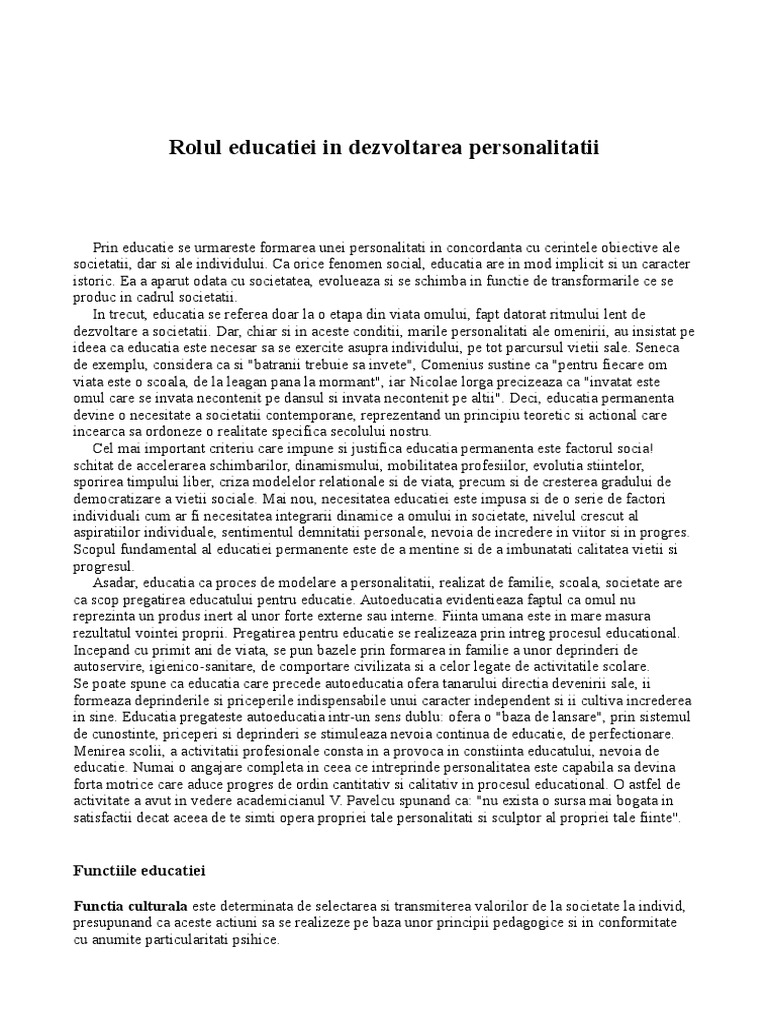 Rolul educatiei in dezvoltarea personalitatii. Este după cum bine se știe cea mai importantă componentă a unei societăți educația este procesul de facilitare a învățării sau de dobândire de cunoștințe aptitudini valori credințe și obiceiuri. Metodele educaționale includ povestirea discuția predarea instruirea și cercetarea. Echipa gorjeanul 29 mai 2017. Acest proiect trateaza educatia dezvoltarea sociala si morala a personalitatii.