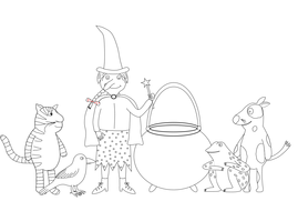 A creature of few words cat prefers to purr or whistle to convey his emotions. All sheets are in black and white. Can also be paired with the book room on the broom. Cat and witch are the best of friends.