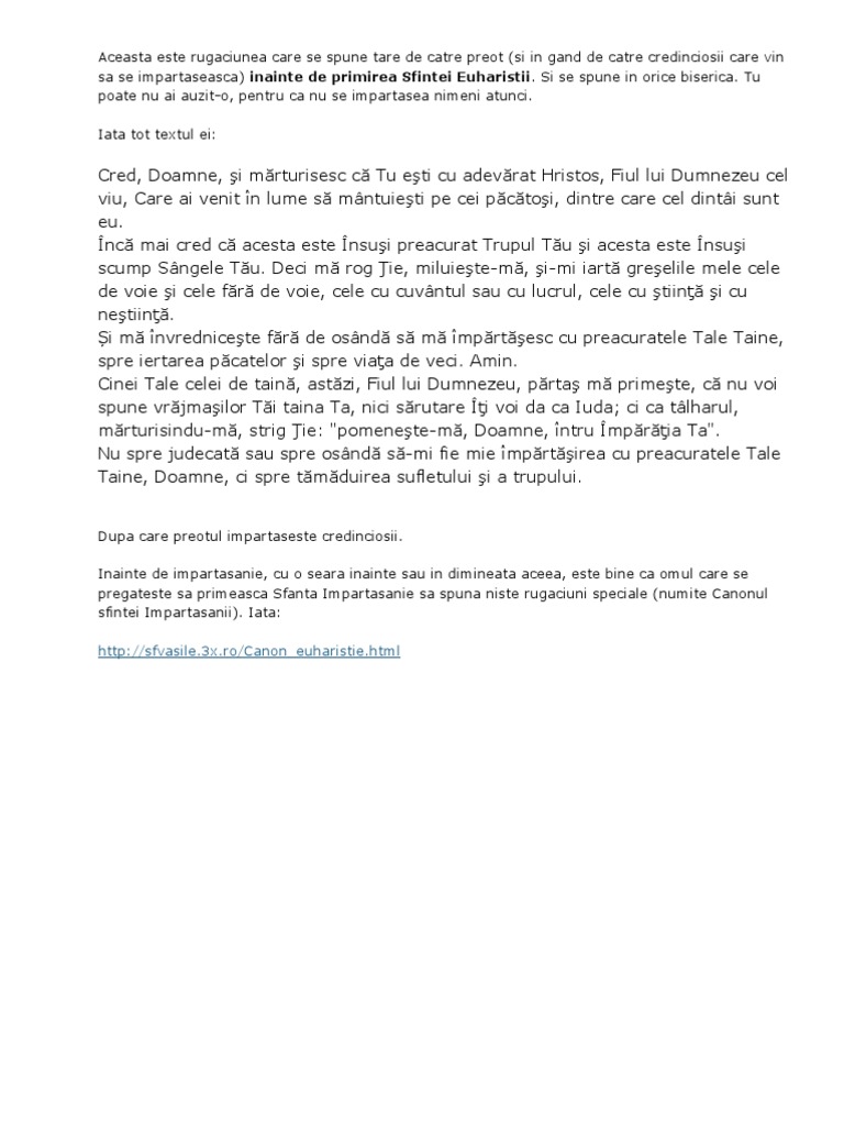 Rugaciuni inainte de impartasanie. Spovedanie rânduiala sfintei spovedanii scrise și citite după ce mai înainte facem canonul de pocăință către dom. Slavă ție dumnezeul nostru slavă ție. La apa odihnei m a hranit. Ci arde cu focul cel fără de materie păcatele mele și mă în vrednicește a mă sătura de desfătarea care este întru tine ca de amândouă ve selindu mă să slă vesc bunule ve ni rea ta.