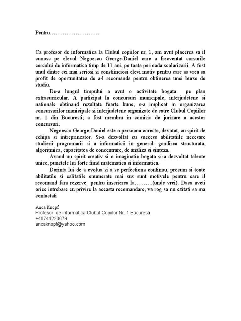 Scrisoare De Recomandare Elev