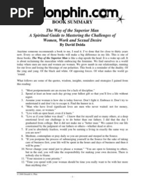 Way of the superior man summary. David deida the way of the superior man pdf. The way of the superior man pdf pdfy mirror item preview remove circle share or embed this item. The way of the superior man 1997 is a self help text and a popular manosphere book mixing spiritualism with relationship and sex advice.