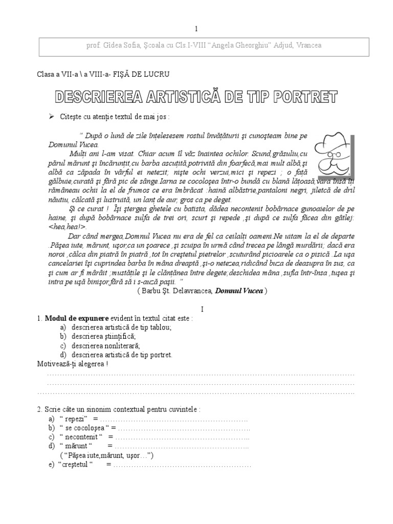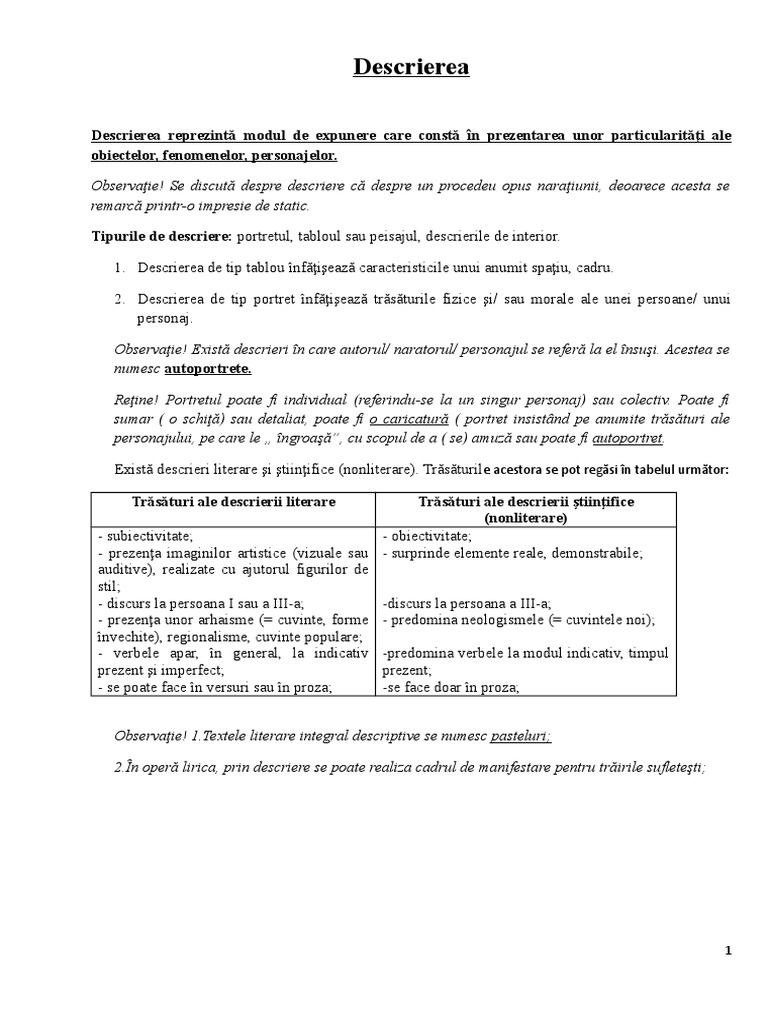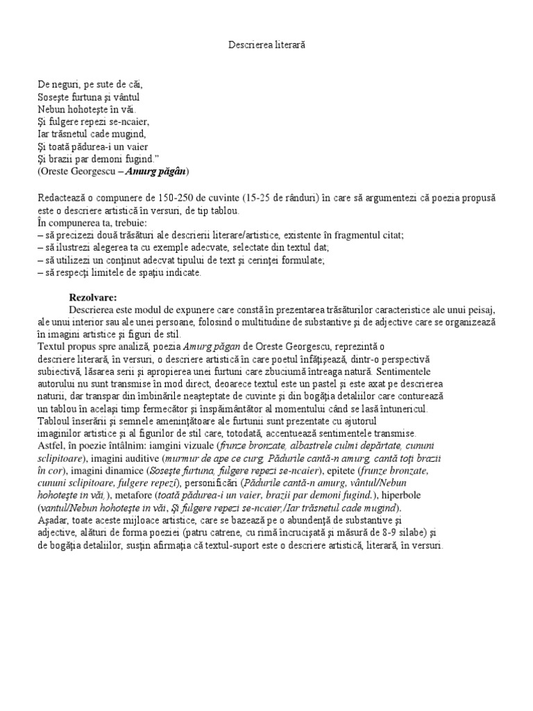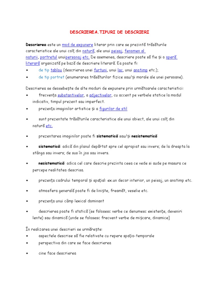 Ofer elevilor un ghid pentru cazul in care acesta ar fi subiectul de teza succes. Deci portretul este imaginea unei persoane ori a unui personaj literar si poate sa apartina sau nu unei opere literare. In cuprins se desfac elementele componente ale peisajului si se descrie apoi fiecare detaliu al acestora. De tip portret enumerarea trăsăturilor fizice și morale ale unei persoane.