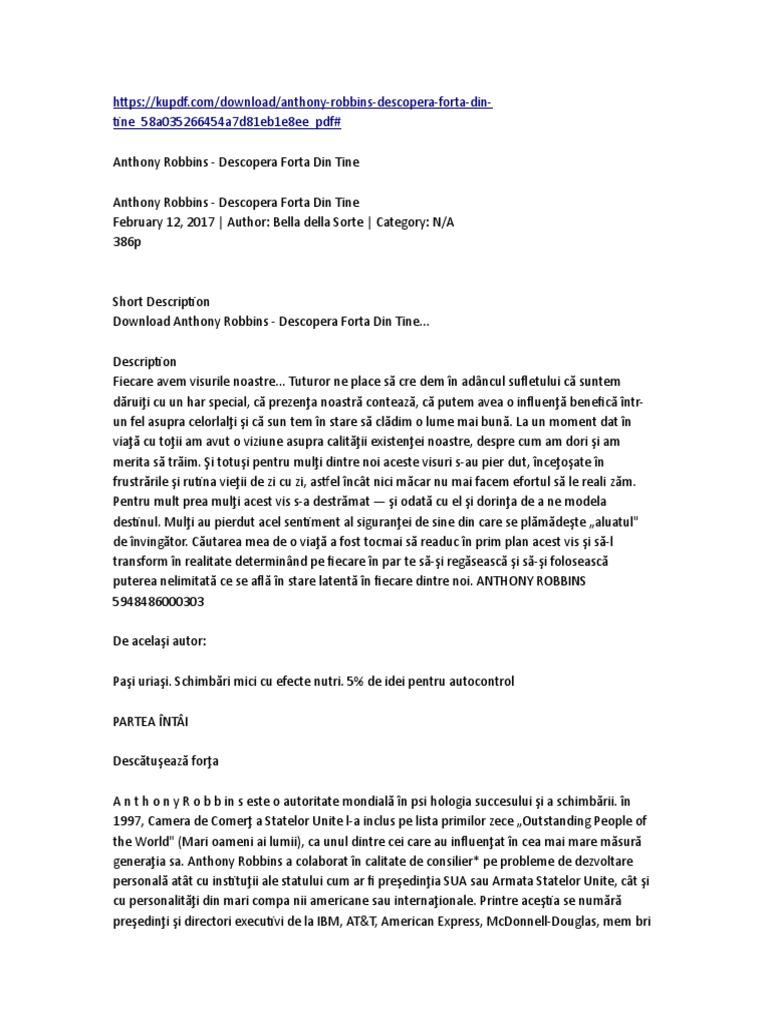 Cuprins multumiri prefal5 la edilia in limba rom6nd cuvant inainte partea int6i. Visul acela pe care l ai uitat intre timp pentru ca te ai lasat copleșit de toate responsabilitațile cu care te a delegat viața. Cartea lui tony robbins are menirea de a te ajuta pe acest drum oferindu ți. Așadar e timpul sa ți implinești visul.