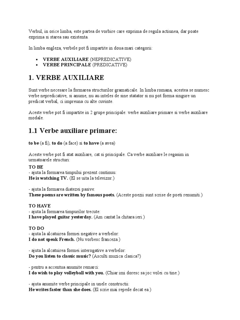To be ajută la formarea aspectului continuu și a diatezei pasive. Vb intranzitiv ea vorbeste des la telefon. Verbele auxiliare formează interogativul și negativul prin ele însele prin inversiunea cu subiectul și adăugarea adverbului de negație. Shall will ajută la formarea viitorului.